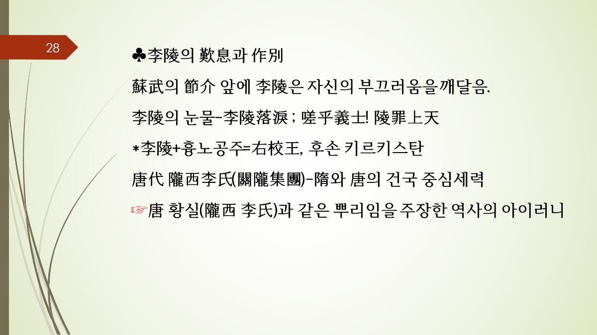 6. 수 나라·당 나라 개국공신과의 연결 (농서 이씨) 이 부분이 역사적으로 가장 드라마틱한 대목입니다. 당나라를 세운 이연(고조)과 이세민(태종)의 가문인 '농서 이씨(隴西 李氏)'는 자신들의 뿌리를 바로 이릉의 할아버지인 이광(李廣) 장군에게 두고 있습니다. • 가문의 분화: * 한 줄기는 한나라에 남아 농서 이씨의 명맥을 이었고(이연의 조상), 다른 한 줄기는 흉노로 간 이릉의 후손이 되어 북방 민족(선비족 등)과 섞였습니다. • 당나라의 포용력: 훗날 당나라 시대에 키르기스(결곤) 사절단이 장안에 왔을 때, 당 태종 이세민은 "우리는 같은 농서 이씨 집안이다"라며 그들을 매우 환대했습니다. • 개국공신: 수나라와 당나라의 건국 주체였던 '관롱집단(關隴集團)'에는 북방 유목민의 혈통과 한족의 문화가 섞인 가문들이 많았습니다. 이릉의 후손 혹은 그 방계 가문들이 북방에서 세력을 키워 중원으로 들어와 수·당의 기틀을 닦는 핵심 세력이 된 셈입니다