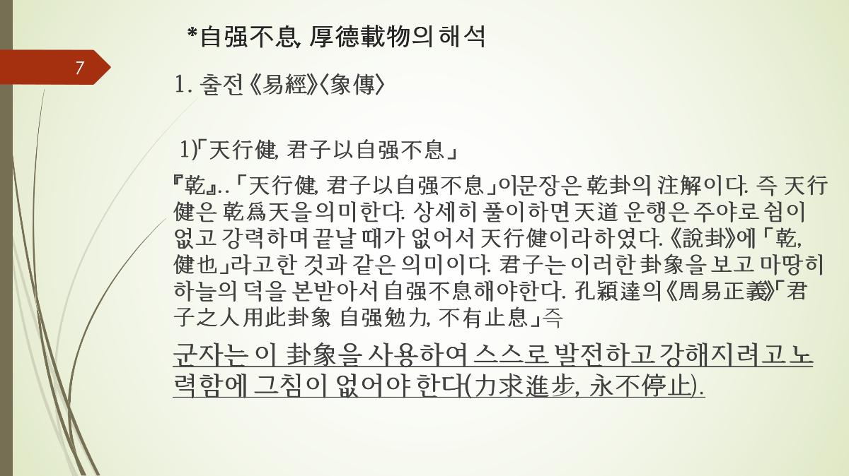 (9) 정지, 《易經》〈乾卦〉「天行健,君子以自强不息」 "하늘의 운행이 주야로 쉼이 없고 강력하며 끝날 때가 없으니, 군자는 스스로 발전하고 강해지려면 노력함에 쉬지 말아야 한다."