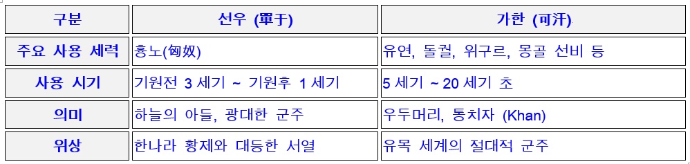 2. 가한 (可汗, Kèhán / Khan) '가한'은 흉노 이후 북방의 주인이 된 유연(柔然), 돌궐(突厥), 위구르, 그리고 몽골 제국 선비족 등에서 사용한 군주 칭호입니다. 우리에게 익숙한 '칸(Khan)'의 한자 표기이기도 합니다. • 칭호의 확산: 5세기경 유연에서 처음 사용되기 시작하여, 6세기 돌궐이 대제국을 건설하면서 북방 민족의 보편적인 군주 명칭으로 자리 잡았습니다. • 천가한(天可汗): 당나라 태종 이세민은 돌궐을 정복한 후 북방 민족들로부터 '천가한'이라는 칭호를 받기도 했습니다. 이는 한족의 황제이면서 동시에 유목민의 우두머리라는 이중적 지위를 상징합니다. • 대표 인물: 몽골 제국의 칭기즈 카안이 전 세계적으로 가장 유명한 '가한'의 사례입니다.