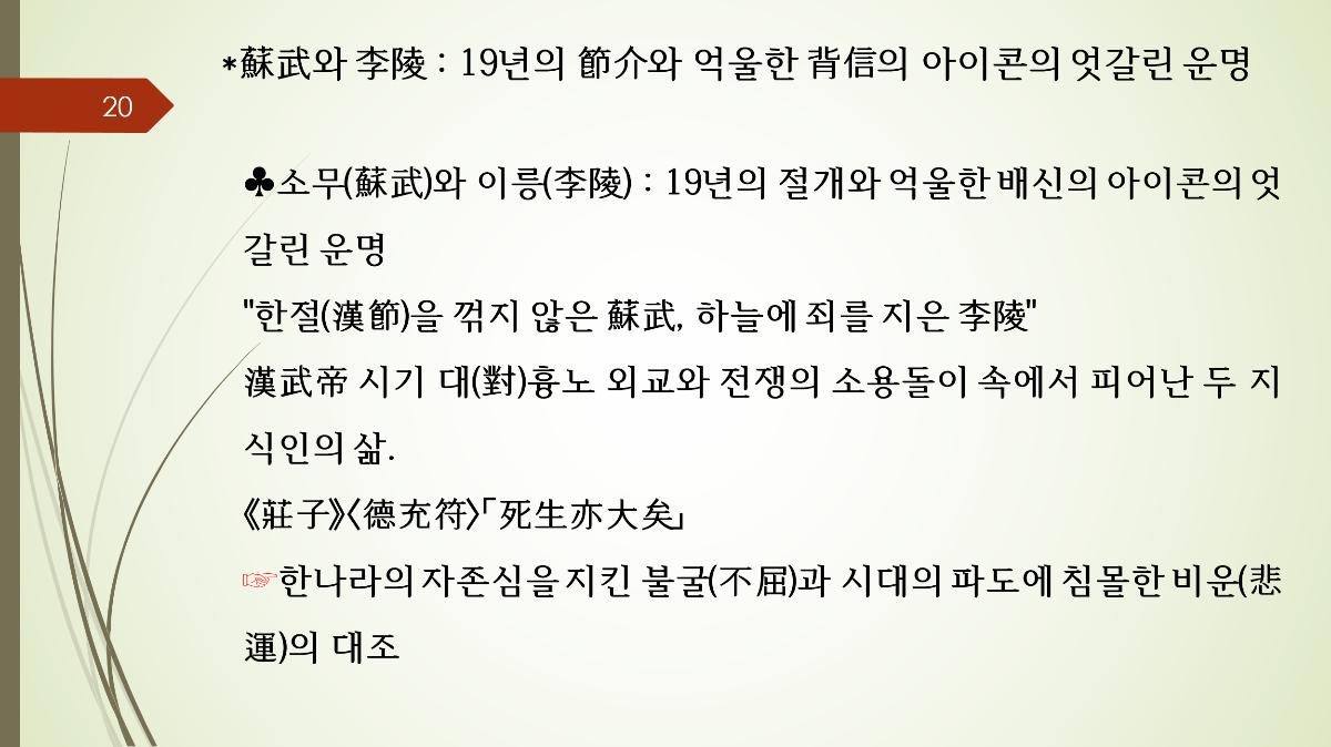 💡 요약하자면 '한청'은 기록을 남기기 위해 대나무의 수분을 정성스레 빼내던 고대인들의 노력이 담긴 말입니다. 소무(蘇武)나 이릉(李陵) 같은 인물들도 결국 이 '한청(역사)'에 그 이름이 남겨져 오늘날 우리에게 전해지고 있는 셈이지요.