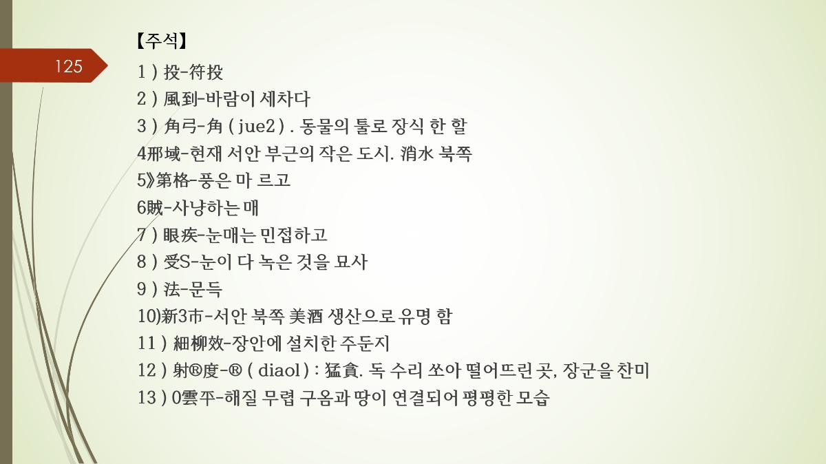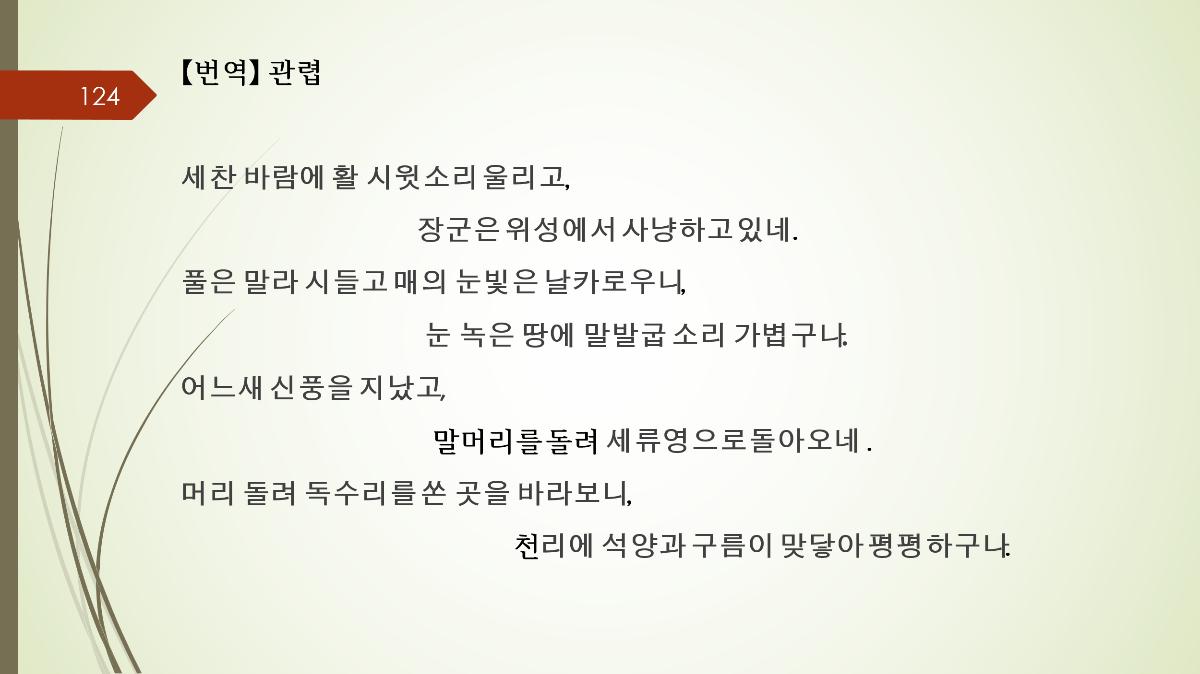 1. 당시제목: 관렵 2. 작자: 왕유(王維, 699~761)