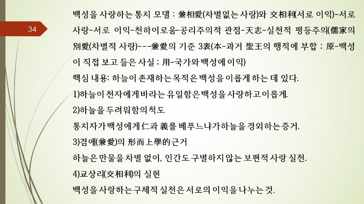 묵가 (묵자) 겸애교리 (兼愛交利) 방향 : 전체를 동시에 (수평적·무차별적) 비판점 : 유가의 사랑은 이기적이며 세상의 분란을 만든다. (묵자) 비유 : 밝은 태양이 온 세상을 똑같이 비추는 것