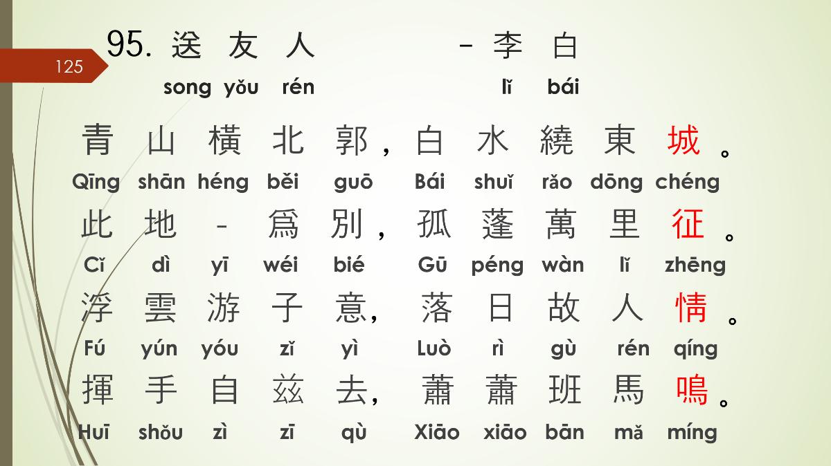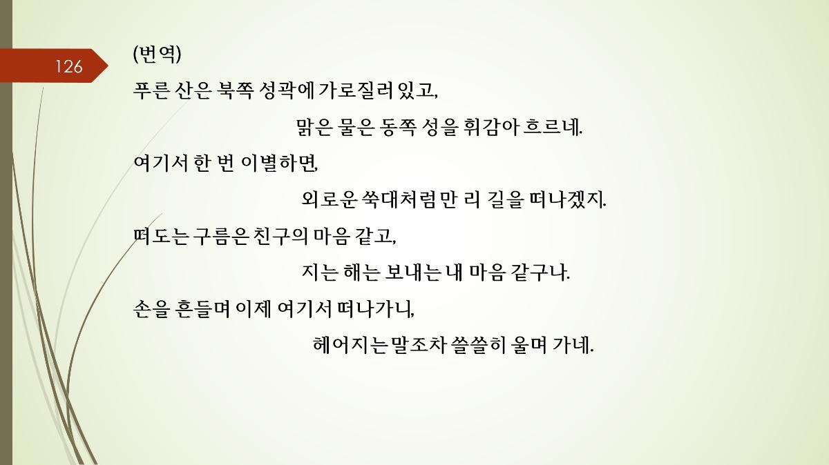 1. 당시제목: 송우인 2. 작자: 이백(李白, 701~762) 당나라를 넘어 중국 문학사에서 가장 위대한 시인 중 한 명으로 꼽히는 이백(李白, 701~762)은 '시의 신선'이라는 뜻의 '시선(詩仙)'이라 불립니다. 그의 삶과 문학 세계를 몇 가지 핵심 키워드로 정리해 드립니다.