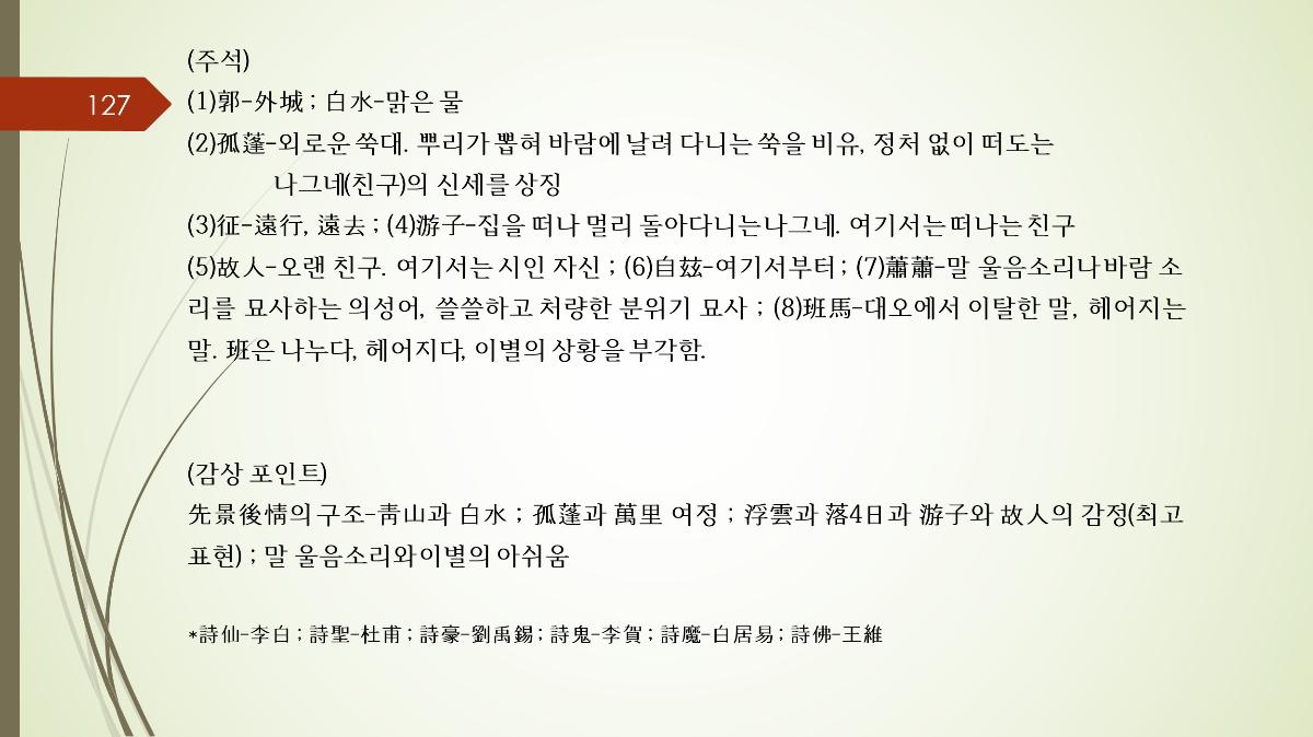 * 당나라 시문학의 전성기를 수놓았던 이 거장들에게 붙여진 별명 • 의미: 시의 신선 • 이유: 이백은 도교적 색채가 짙고, 인간 세상을 초월한 듯한 호쾌하고 자유분방한 시를 썼습니다. 규율에 얽매이지 않는 천재적인 상상력과 낭만적인 분위기 때문에 "하늘에서 내려온 신선" 같다고 하여 붙여진 이름입니다.