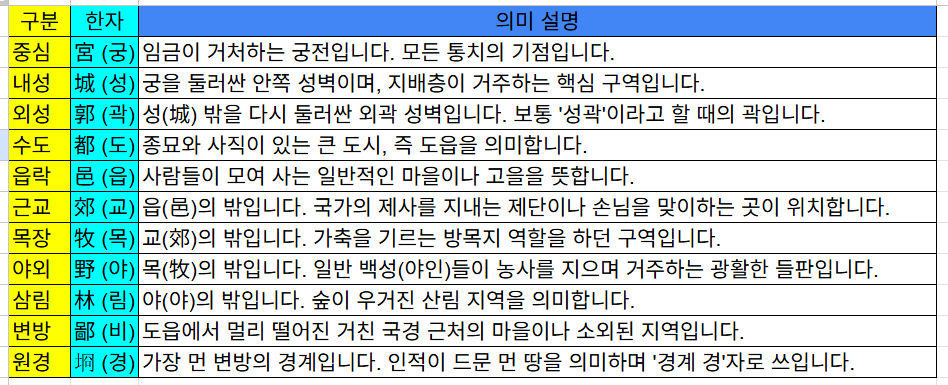 《이아(爾雅)》의 〈석지(釋地)〉 편과, 국가의 제도와 관직을 기록한 《주례(周禮)》의 주석 등에서 찾아볼 수 있습니다. 특히 《이아》에 성문 밖의 구역을 점진적으로 확장하며 정의하고 있습니다.