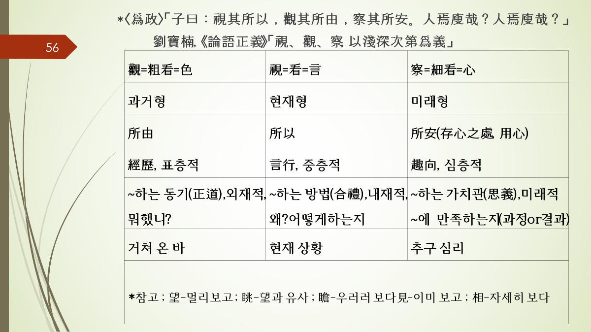공자의 擇壻嫁女, 사윗감 조건 - 人品, 〈爲政〉「視其所以,觀其所由,察其所安」 그 사람이 하는 바탕(언행)을 보고, 그 행위의 동기나 거쳐 온 동기를 살피며, 그가 어디에 편안함을 느끼는지 심리를 관찰한다.