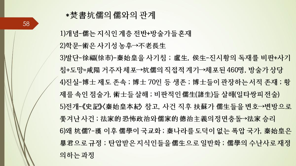 1. 태워버린 책의 종류와 내용 (분서, 焚書) 진시황은 승상 이사의 건의를 받아들여, 국가가 허용한 범위를 벗어난 모든 사적 학문을 금지했습니다.