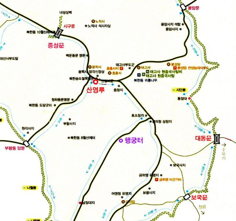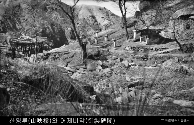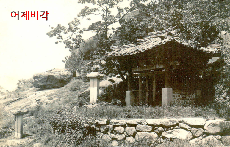 ▼ 어제 비각(御製碑閣) 과 산영루(山映樓) • 어제 비각은 숙종이 북한산성 행차 후 경치에 감탄하여 남긴 시 6수가 새겨진 비석을 보호하던 곳 • 행궁은 산영루(현재 복원) 동쪽에 위치했으나 현재는 터만 남음 • 임금이 북한 산성에 행행(行幸) 하였다. 아침 일찍 떠나 서교(西郊)를 경유하여 북한 산성에 이르렀다. 서문(西門)으로 들어가 수문(水門)을 차례로 관람하고 이어 소석가현(小釋迦峴)에 올라 성(城) 안팎을 두루 보고자 하였으나 길이 험하고 닦아지지 않았기 때문에 단지 시단봉(柴丹峰)에만 올랐을 뿐이었다. -숙종실록 1712년 4월 12일 (숙종 38 )-