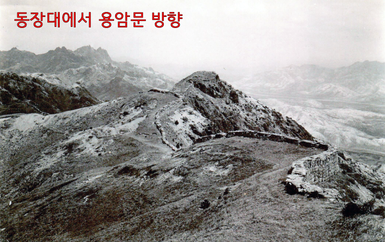 1. 동장대(총 지휘소)에서 바라본 용암문 방향 북한산성 • 1911년. 노르베르트 베버 • 현재는 성벽을 따라서 등산로가 쭉 나 있고 양쪽으로 수풀이 우거져 있어서 사진과 같은 조망은 보기 어렵다.