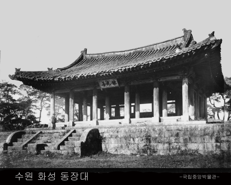 6.중성문(中城門) • 1907년. 헤르만 산더 • 옛 사진 속 중성문은 내성에서 바라본 모습이다. 중성문 오른쪽에 시구문(屍軀門)과 수문이 위치해 있으며 현재는 무너져 없는 수문의 모습도 보인다. 이 밖에도 오른쪽으로 북장대 방향으로 이어지는 중성 성벽과 여장이 확인된다. 현재의 문루와 여장은 1998년 복원된 것이다.