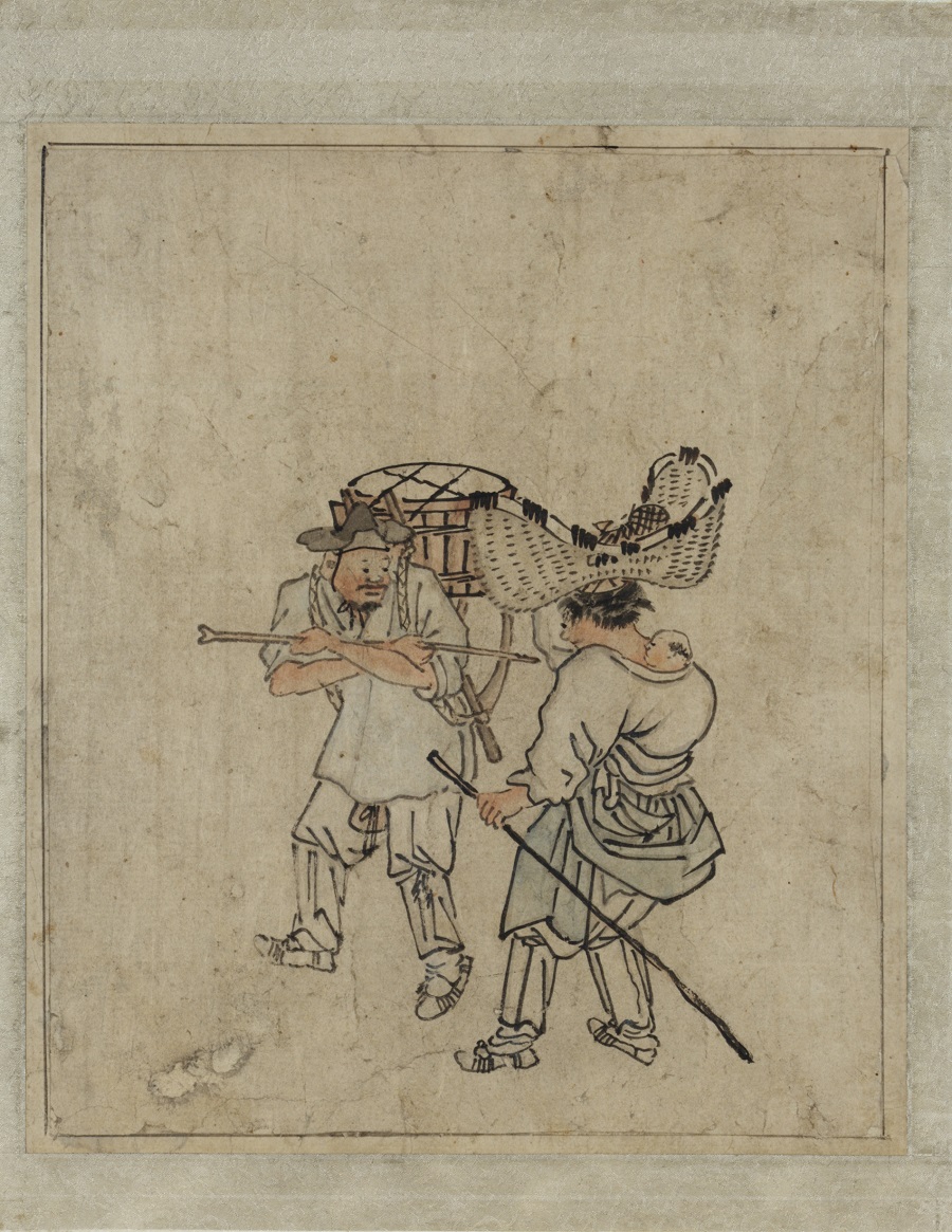 낡은 벙거지를 쓰고 지게에 나무통을 진 상인과 광주리를 인 부인이 머리에 인 부인 모두 무릎의 행전(行纏) 을 묶고 행상을 떠나기 위해 서로 헤어지는 광경을 그린 듯하다. 저고리 안으로 아이를 업은 아낙의 모습이 퍽 이채롭다.